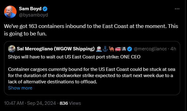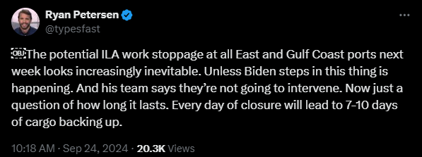 How are you preparing for the potential strike? Are you already screwed with tons of cargo en route? Do you think Biden invokes Taft-Hartley, or will Christmas be ruined? Email me.