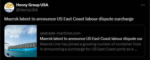 “Due to potential labour disruptions, Maersk is implementing a local Port Disruption Surcharge for all cargo moving to and from the US East Coast and Gulf Coast terminals, effective October 21, 2024.” – Maersk’s latest trade alert