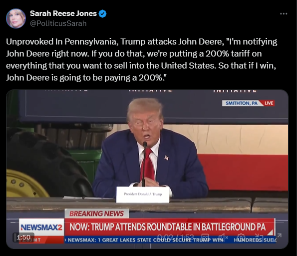 At a rally in Pennsylvania, Trump told supporters, “I am just notifying John Deere right now that if you do that, we are putting a 200% tariff on everything that you want to sell into the United States.”