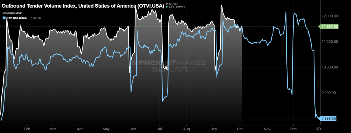 SONAR: Outbound Tender Volume Index — Seasonality View: 2024 (white) and 2023 (blue)