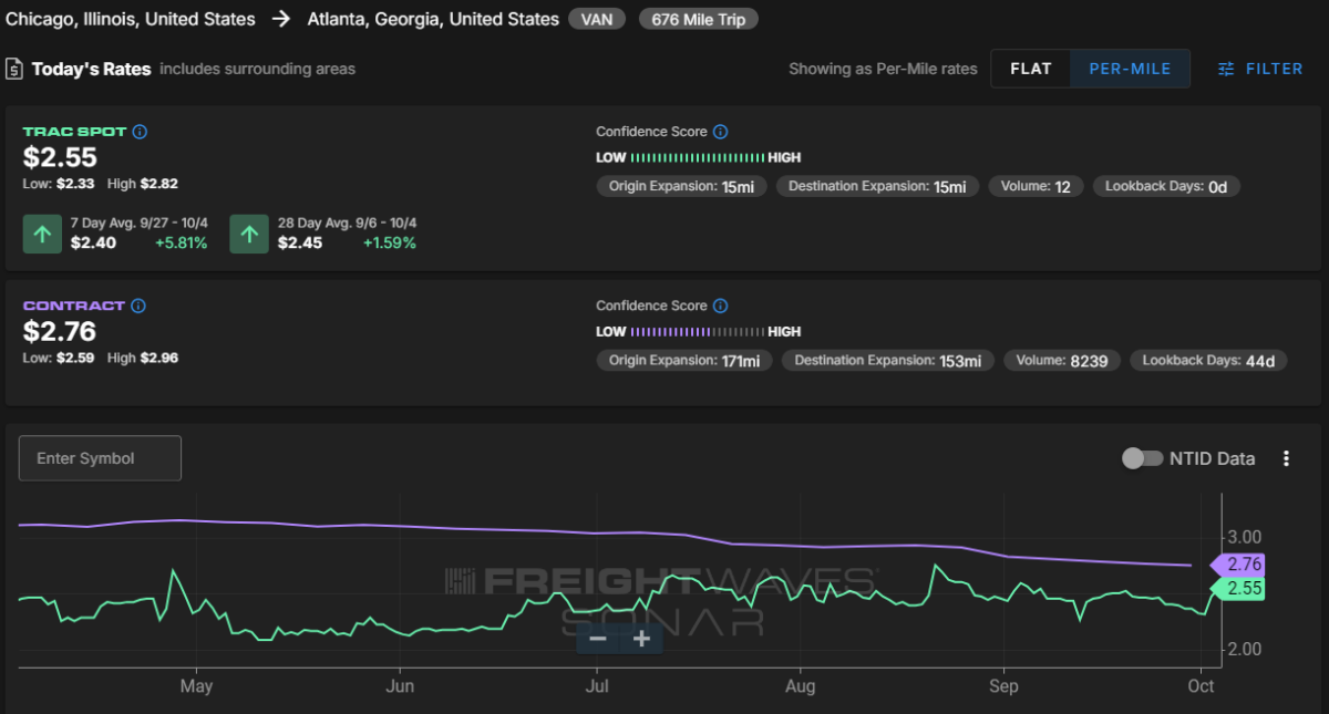 From Chicago to Atlanta, spot rates rebounded to start October. The FreightWaves TRAC spot rate along this lane rose 14 cents per mile to $2.55, now 21 cents per mile below the contract rate.