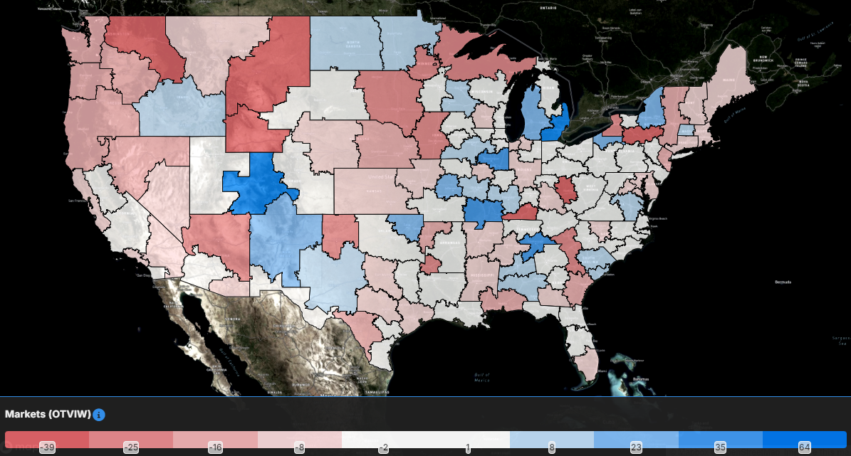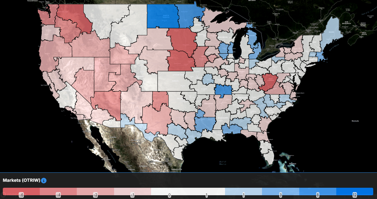 The map above shows the Outbound Tender Reject Index — Weekly Change for the 135 markets across the country. Markets shaded in blue are those where tender rejection rates have increased over the past week, whereas those in red have seen rejection rates decline. The bolder the color, the more significant the change.