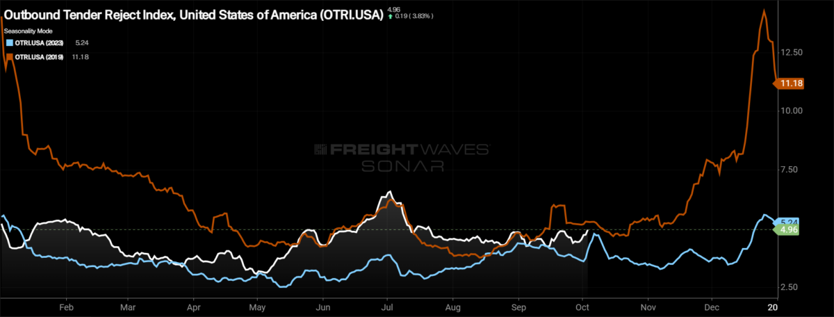 SONAR: Outbound Tender Reject Index – Seasonality View: 2024 (white), 2023 (blue) and 2019 (orange)