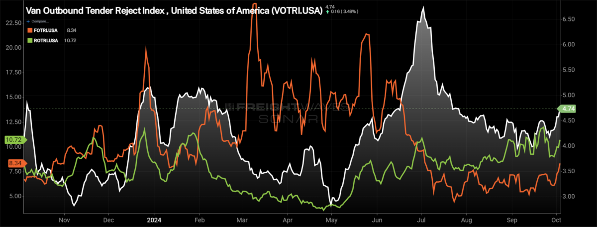 The strike impacts on capacity have been minimal, but rejection rates have moved higher this week after ending September on a sour note. Even with the movement higher, rejection rates remain below 5%. The slight volatility this week was a positive sign for the market, hopefully setting the stage for some positive signs in the back half of the fourth quarter.