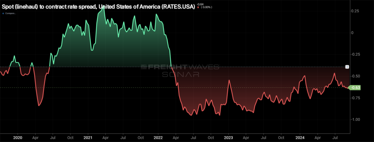 The chart above shows the spread between the NTIL and dry van contract rates is trending back to pre-pandemic levels. The spread remains historically wide and has actually widened in recent weeks, diverting from the pre-pandemic average that it had been inching closer to throughout the year. Significant disruptions can quickly tighten the spread as spot rates react much faster, so seeing a narrowing of the spread in the fourth quarter, during truckload peak season, wouldn’t be a surprise. The question is how significant the narrowing is and whether it is sustainable, especially if the first quarter of 2025 is the traditionally soft period for freight demand.