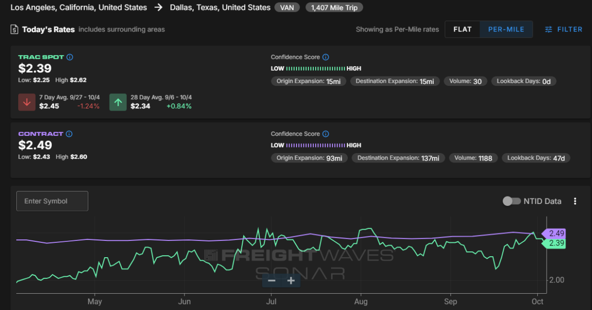 The FreightWaves Trusted Rate Assessment Consortium spot rate from Los Angeles to Dallas fell slightly over the past week but in a significant way. The TRAC rate from Los Angeles to Dallas decreased by 3 cents per mile to $2.39. Spot rates along this lane are now just 10 cents per mile below the contract rate.