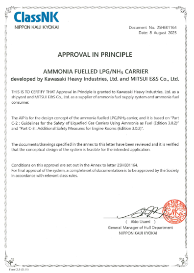 Mitsui E&S has secured Approval in Principle (AiP) from ClassNK for an ammonia-fueled LPG/ammonia carrier. The project is a collaboration with Kawasaki Heavy Industries, which is building the vessel.