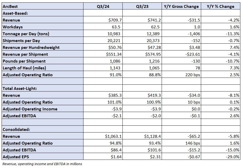 ArcBest (NASDAQ: ARCB) reported third-quarter adjusted earnings per share of $1.64, 21 cents below the consensus estimate and 67 cents lower year over year. Consolidated revenue of $1.06 billion was 5.8% lower y/y.