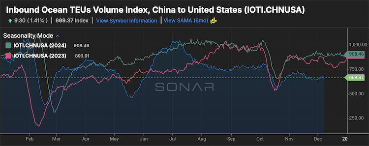 SONAR index showing drop in loaded containers China-U.S. this year compared to 2024 and 2023.