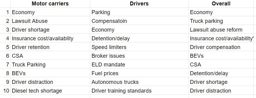 Besides the economy at No. 1 and parking at No. 7, motor carriers’ key issues were: