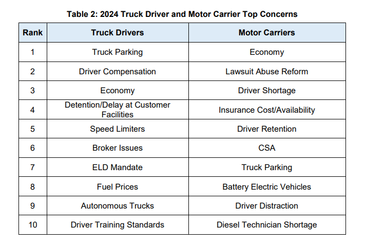 Splitting up the respondent data between drivers and motor carriers yields a more nuanced picture of what each side sees as top issues. Truck drivers ranked truck parking first, followed by driver compensation, economy, detention/delay at customer facilities, and speed limiters to round out the top five. For motor carriers, the economy remained the top concern followed by lawsuit abuse reform, driver shortage, insurance cost and availability, and driver retention.
