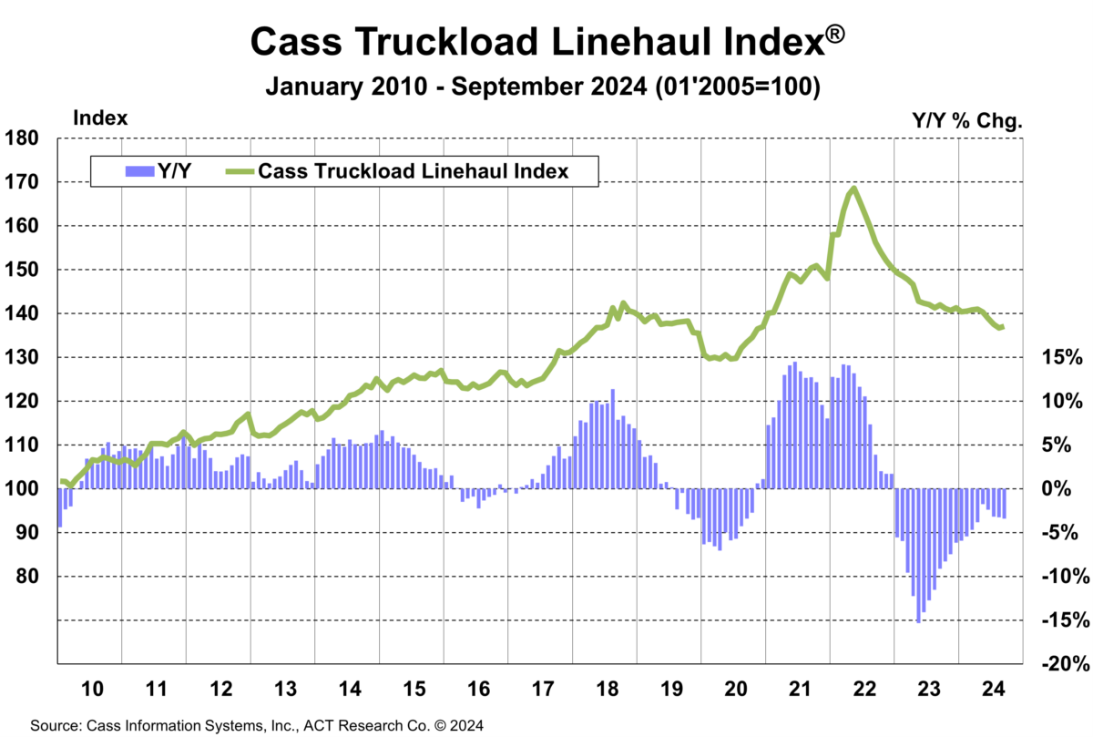 Freight audit and payment provider Cass Information Systems recently released its September data, which saw a decline in shipments but an increase in freight expenditures, freight rates and truckload linehaul rates. For truckload linehaul rates, rising spot rates pushed the combined spot and contract index higher 0.3% m/m, breaking a string of declines seen the past four months.