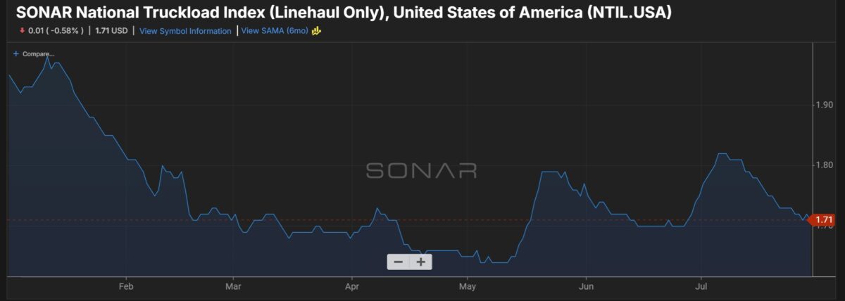 Increases in driver pay are coming against spot linehaul rates that are lower than they were at the start of the year, according to the NTIL index in SONAR.