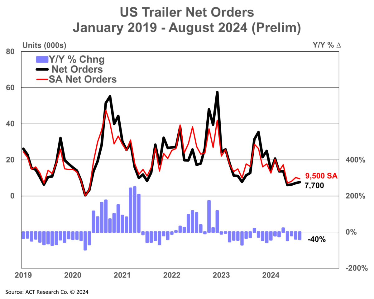 Following seasonally weak order numbers in the Class 8 space, trailer orders in August also saw large year-over-year declines as cash-strapped fleets hit the pause button on new equipment orders. Recent data from ACT Research shows preliminary net trailer orders increased 500 units from July to 7,700 units, an improvement, but 40% lower y/y than August 2023. August’s data brings year-to-date U.S. trailer net orders to 89,400 units, down 27% compared to the first eight months of 2023.