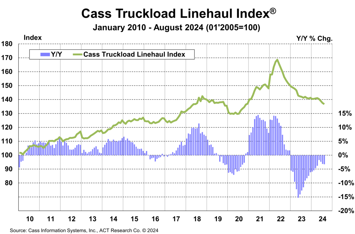Another standout came from the Expenditures Index, which fell 2% m/m in August, down 9% y/y versus a 6.2% y/y drop in July. The Cass Truckload Linehaul Index, which includes both spot and contracted freight, saw its fourth straight month of declines, falling 3.3% in August versus 3.2% m/m in July. Denoyer added, “With spot rates steady over the past year, downward pressure on the larger contract market is lessening, but recent slight increases in spot rates are not yet enough to turn contract rates higher.”