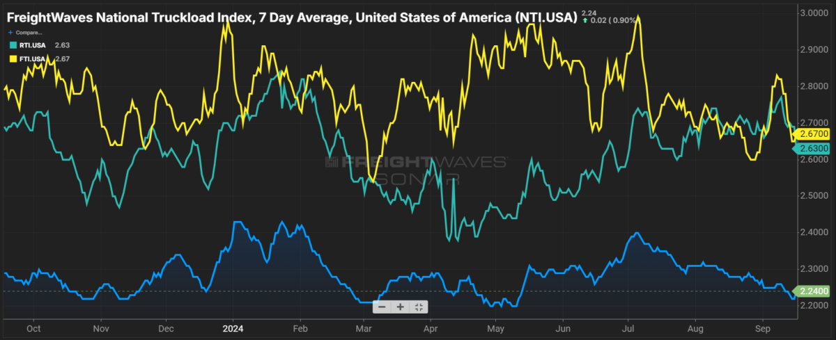 The largest weekly decline came from the flatbed segment, with FTI falling 15 cents per mile all-in from $2.82 on Sept. 9 to $2.67. Contracted outbound tender rejection rates remain depressed, down 6 basis points w/w from 5.6% to 5.54%.