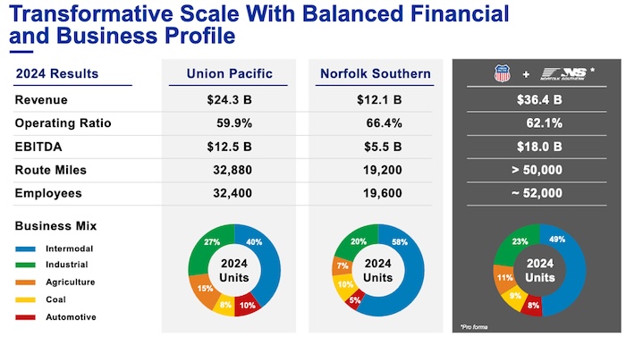 Assuming shareholders approve the deal, UP will acquire NS in a stock and cash transaction that values NS at $320 per share, a 25% premium. The combined company would have an enterprise value of more than $250 billion. The railroads said the merger would create $2.75 billion in annual synergies, split between $1.75 billion in revenue growth and $1 billion in cost and productivity savings.