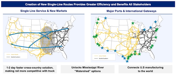 The historic combination — which would create the first transcontinental railroad in the U.S. — would unleash growth by eliminating problematic interchanges, speeding and simplifying service, and enabling the railroad to tap the so-called watershed markets along the Mississippi River. UP and NS envision reeling in $1.75 billion in growth-related revenue by the third year of their merger.