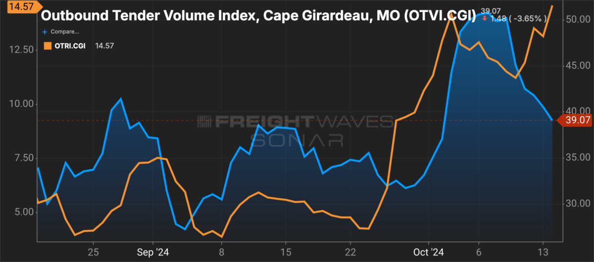 Fortunately there appears to be no new pandemic on the horizon to account for this drastic uptick. It’s more likely an indicator of the P&G plant working overtime to catch up on the rush of toilet paper following the panic-buying that occurred as a result of the East Coast port worker strike. In a few weeks, volumes and rejections will return to normal and Cape Girardeau will return to being a market that doesn’t take priority for securing coverage.
