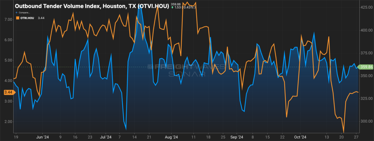 Market Check.This week’s SONAR market goes down to South Texas where everything doesn’t appear to be bigger. Outbound tender volumes in Houston have reached some stability with little deviation week over week as volumes are changing less than 1%. That stability however, cannot be applied to outbound tender rejections, which have risen 344 basis points w/w to come in at 3.44%.