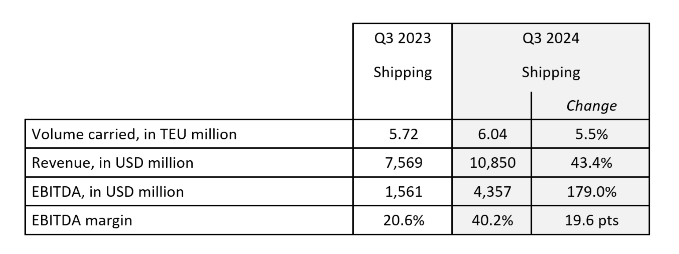 Furthermore, the table presents CMA CGM Group’s financial performance for the third quarter of 2024 compared to the same period in 2023. The company’s revenue increased significantly, reaching almost US$16 billion, up 38.5% from Q3 2023. EBITDA saw substantial growth, rising by 149% to US$5 billion from US$2 billion in the prior year’s quarter.