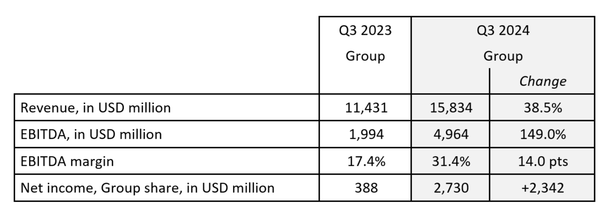 In addition, EBITDA margin improved markedly by 14% points, from 17.4% in Q3 2023 to 31.4% in Q3 2024, reflecting enhanced profitability. Moreover, the net income for the Group skyrocketed to US$2.7 billion.