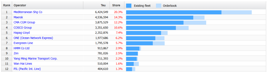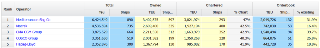 In other significant ranking shifts, when combining the existing fleet and orderbook, Taiwanese major ocean carrier Evergreen has aggressively challenged and surpassed Japanese liner operator Ocean Network Express (ONE).