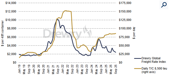 As newbuilds enter service, demand slows, and Suez Canal routes reopen, the imbalance will fade. “At some point, the impetus to hire ships will unwind,” Drewry noted. “The charter market can’t defy fundamentals forever.”
