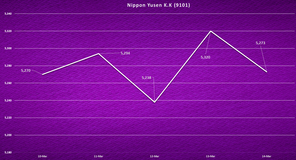 NYK demonstrated relative stability, moving within a narrow band before ending at ¥5,273. The fluctuations suggest market indecision, possibly due to mixed signals from the broader shipping sector. NYK’s exposure to car carriers, bulk shipping, and container operations provides a diversified revenue stream, but market participants remain cautious given the overall rate environment.