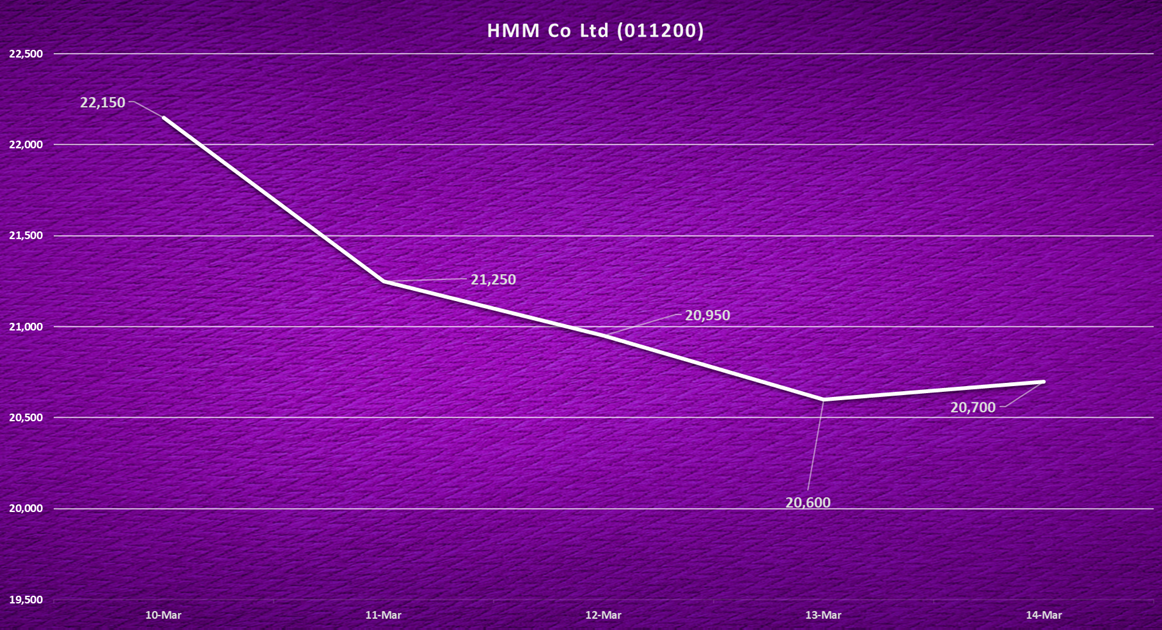HMM experienced a significant decline, dropping from ₩22,150 to a low of ₩20,600 before recovering slightly to ₩20,700. The sharp drop suggests pressure from weakening freight rates or profit-taking after previous gains. As South Korea’s largest shipping line, HMM remains a critical industry player, but investor confidence will depend on its ability to maintain profitability amid shifting rate conditions.