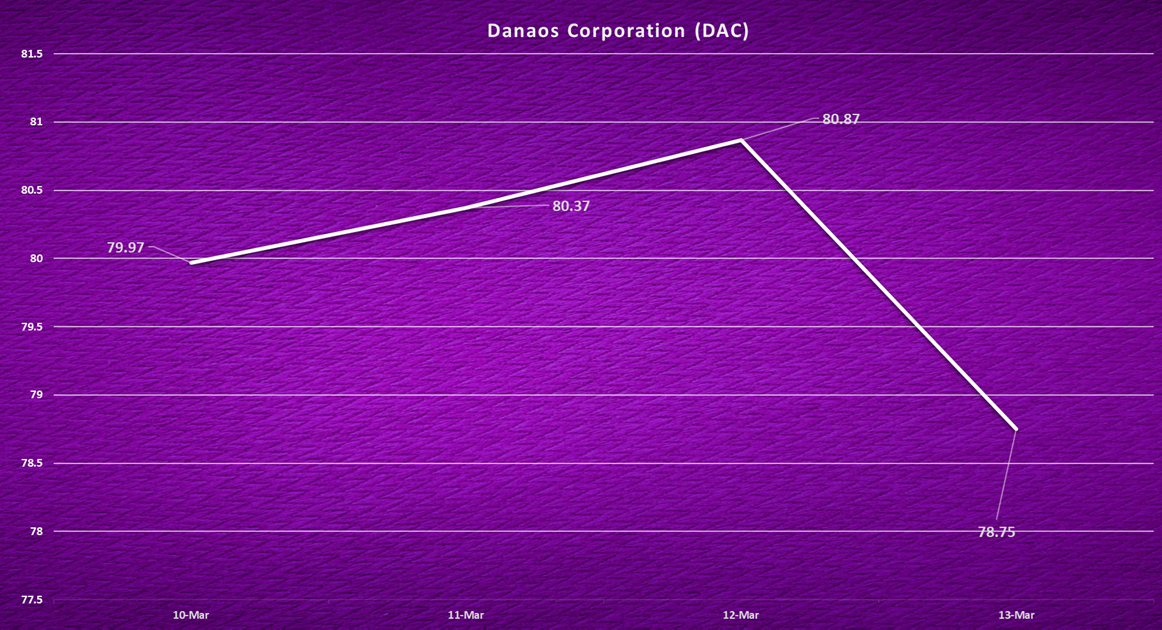 Danaos moved within a relatively tight range, hitting a high of US$80.87 before declining to US$78.75. The company’s exposure to long-term charters provides stability, but market fluctuations in container shipping influence investor sentiment. Analysts will be looking at forward bookings and fleet utilization for further direction.