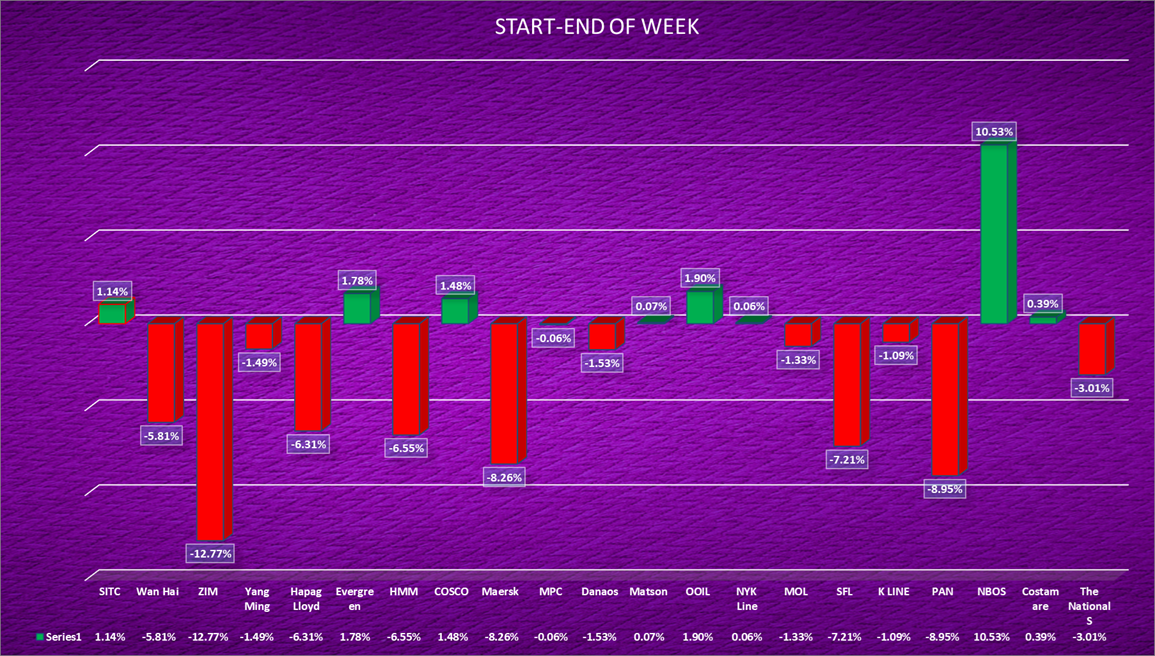 On the other hand, Ningbo Ocean Shipping (+10.53%) emerged as the strongest gainer, signaling resilience in regional shipping demand. Evergreen (+1.78%), COSCO (+1.48%), and OOIL (+1.90%) also posted modest gains. The overall market sentiment appears bearish, with more companies in decline, reflecting a turbulent week for the industry. Moving forward, external factors like freight rates and demand fluctuations will be key in determining stability in the Container Market.