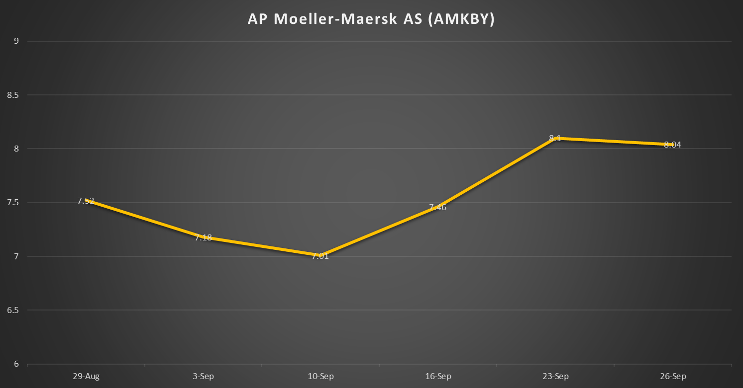 The stock prices for AP Moeller-Maersk AS (AMKBY) show a fluctuation over the observed period. Starting at USD7.52, the price dipped to USD7.18 and USD7.01, indicating a short-term decline. However, the stock rebounded, climbing to USD7.46 and eventually reaching a high of USD8.10 before stabilizing slightly lower at USD8.04. This trend suggests a recovery following initial weakness, with the stock showing resilience in its upward trajectory.