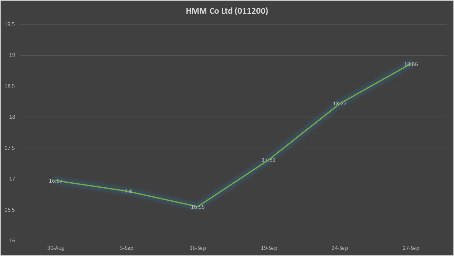 The stock prices for HMM Co Ltd display a steady upward trajectory. Beginning at KRW16,970, the price dipped slightly to KRW16,800 and KWR16,550 before rebounding to KRW17,310. The stock continued its rise, reaching KRW18,220 and eventually peaking at KRW18,860. This pattern suggests consistent growth after an initial dip, with strong upward momentum throughout the period.