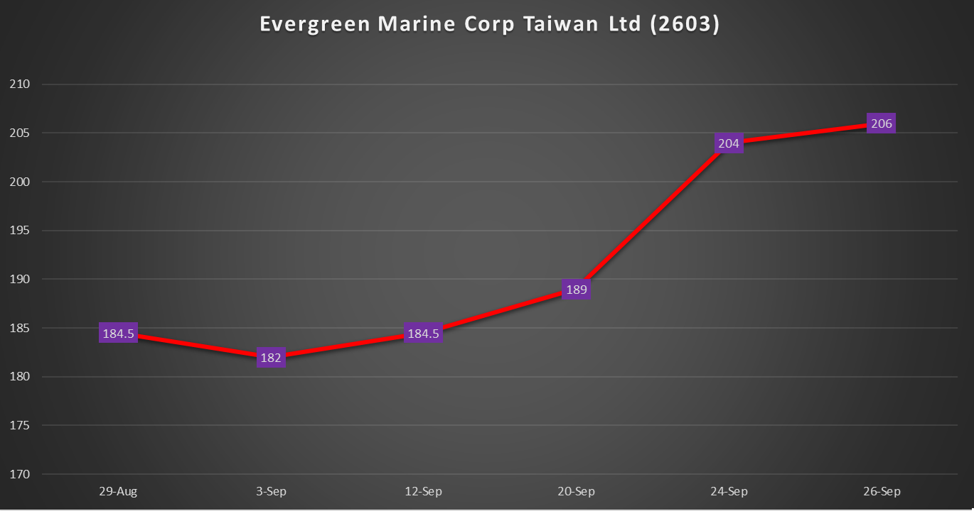 The stock prices for Evergreen show a steady increase over time. Starting at TWD184.5, the price dipped slightly to TWD182 before rebounding to TWD185.5 and TWD189. The upward momentum continued with the stock reaching TWD204 and eventually peaking at TWD206. This trend indicates consistent growth, particularly toward the later stages of the period.