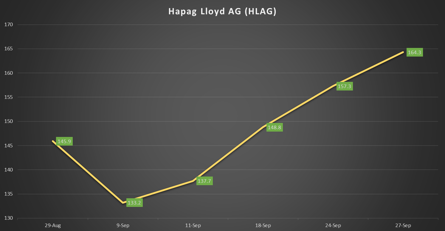 The stock prices for Hapag-Lloyd AG (HLAG) exhibit a mix of volatility and growth. Starting at EUR145.9, the price declined to EUR133.2 before rebounding to EUR137.7 and EUR148.8. The upward trend continued as the stock reached EUR157.3 and eventually peaked at EUR164.3 (at the time this article was written), suggesting a strong recovery and overall positive momentum throughout the period.
