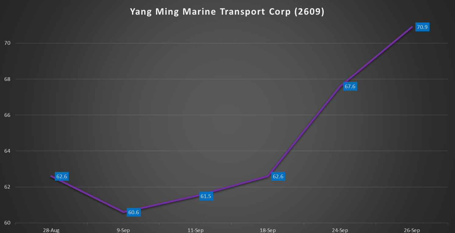 The stock prices for Yang Ming Marine Transport Corp demonstrate a gradual upward trend over the observed period. Starting at TWD62.6, the price dipped to TWD60.6 before recovering slightly to TWD61.3. The stock then continued its ascent, reaching TWD62.6 again and climbing further to TWD67.6 and ultimately peaking at TWD70.9. This pattern reflects a consistent recovery and positive momentum in the stock’s performance.