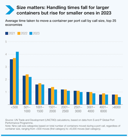 “A record of almost 250,000 port calls by container ships in the second half of 2023 were driven by growing trade and longer routes, causing some congestion, especially in Asia, which handles 63% of global container trade,” UNCTAD said.