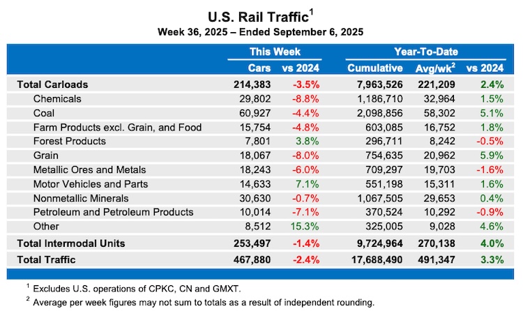 Through 36 weeks, U.S. rail volume is 17,688,490 carloads and intermodal units, an increase of 3.3% over the same period in 2024. That includes 7,963,526 carloads, up 2.4%, and 9,724,964 intermodal units, up 4%.