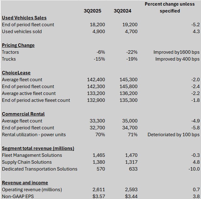 Fleet Management Solutions is where used vehicle sales hits the company’s earnings. Ryder reported that used vehicle pricing was down 6% and 15%, respectively, for tractor and truck sales compared to the second quarter of 2024. But sequentially from the second quarter, tractor pricing was unchanged and truck pricing was up 7%, “reflecting a higher retail mix,” Ryder said.