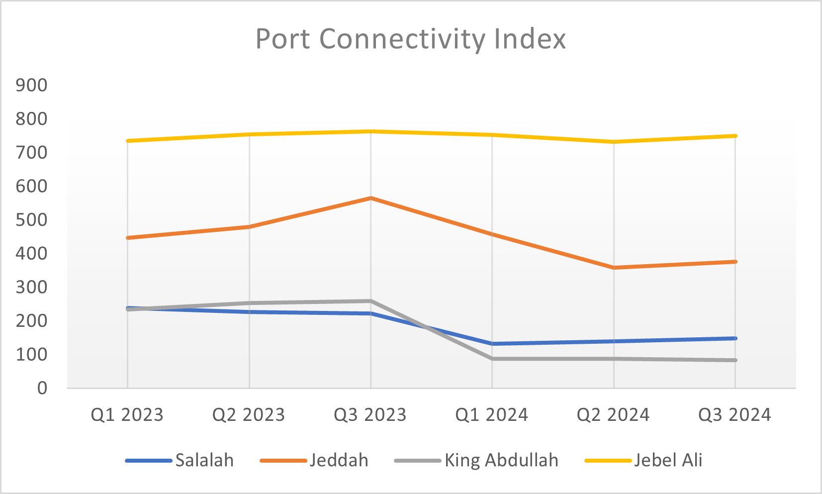 On the other hand, Jebel Ali Port in the UAE maintained robust operations, handling 19.3 million TEUs in 2023 and ranking 7th globally in the LPI, indicating strong logistical capabilities and ongoing efforts to bolster global trade connections. Connectivity trends from 2023 into 2024 remained stable and strong, underscoring Jebel Ali’s pivotal role as a global transshipment hub.