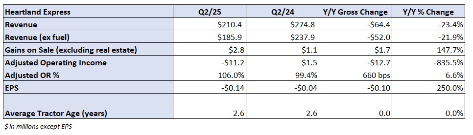 Revenue fell 23% y/y to $210 million, which was $20 million shy of consensus. Excluding fuel surcharges, revenue was down 22% y/y. Like other TL carriers, Heartland has been culling its fleet count and walking away from some unprofitable freight. However, the latest downturn has been protracted and Heartland has been unable to orchestrate a turnaround at some of its previously acquired brands.