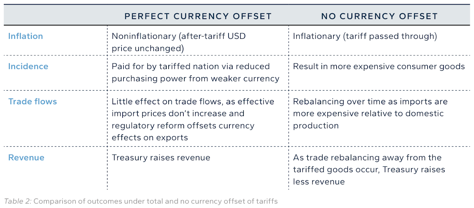 Even if no currency offset were to occur (which is extremely unlikely), inflation would only be aggravated in the short term. The medium-to-long-term consequences would be that manufacturing would return to the U.S. or other tariff-exempt countries and that consumers would shift their demand to goods of this provenance. That manufacturing returns to the U.S. and not other countries depends on the incentives offered, a discussion beyond the scope of this article.