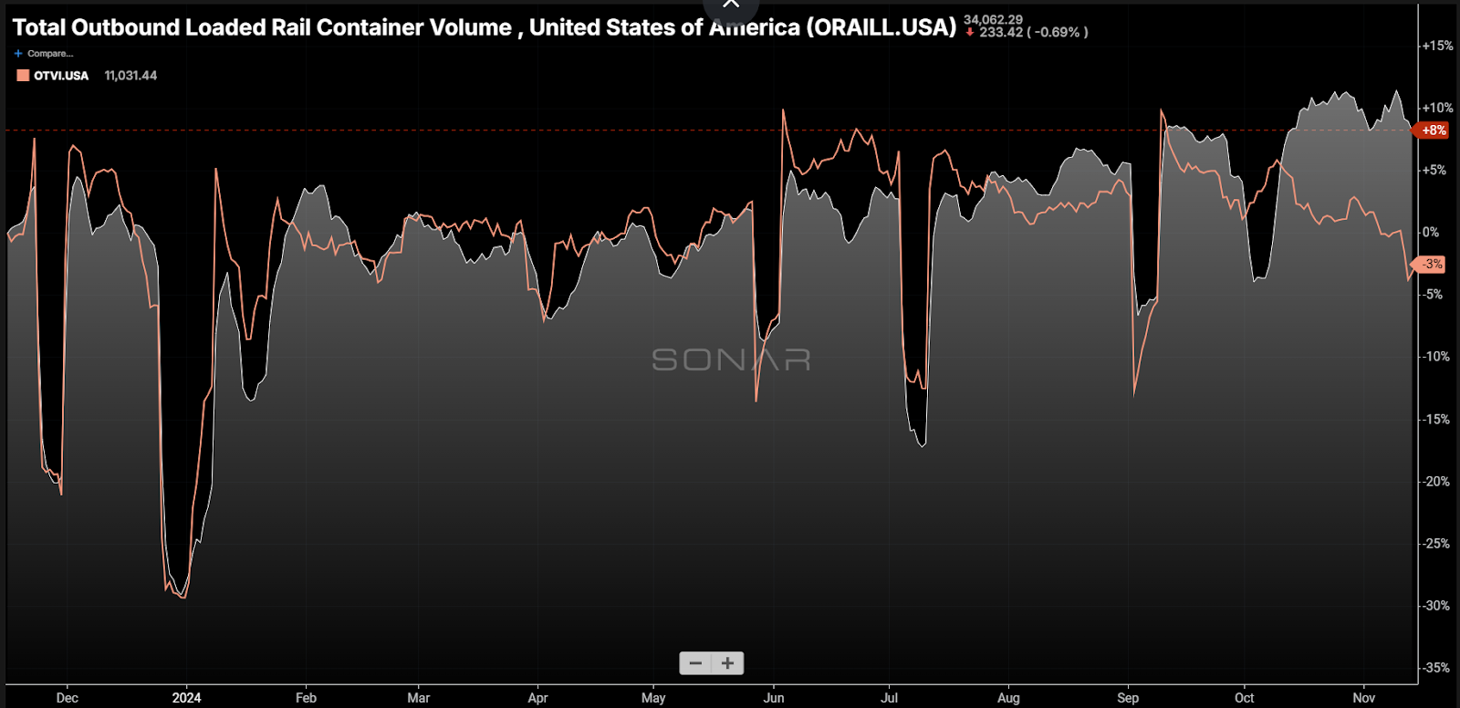 Intermodal demand remains elevated through early November, averaging over 8% higher from an annual perspective. Truckload demand appears to be waning at the same time, with the national Outbound Tender Volume Index (OTVI) showing 3% lower versus this point in 2023. Intermodal demand tends to decline in November as supply chains shift to a more reactive state. Is intermodal keeping a lid on a truckload market breakout?