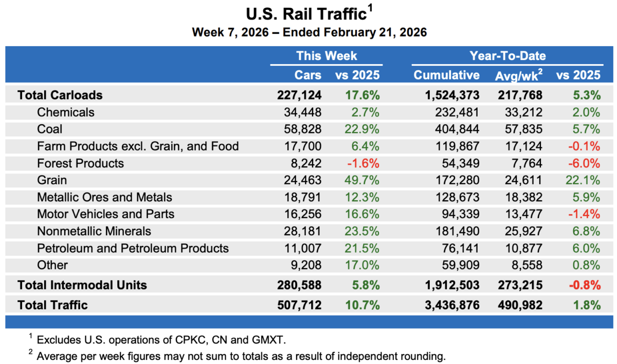 For the first seven weeks of 2026, U.S. railroads saw cumulative volume of 1,524,373 carloads, up 5.3% y/y, and 1,912,503 intermodal units, off 0.8%. Total combined traffic year-to-date was 3,436,876 carloads and intermodal units, ahead by 1.8%.