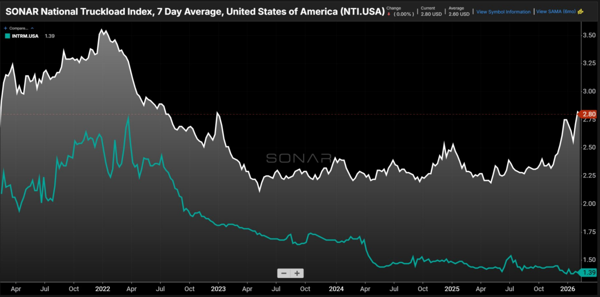 The freight market has been sending mixed signals for months, but one trend stands out clearly as we move deeper into 2026: trucking spot rates have staged a meaningful recovery, while intermodal rates remain stubbornly anchored near cycle lows.