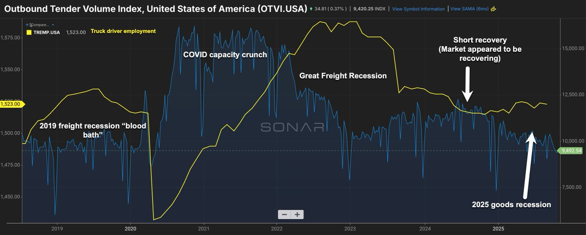 But 2025 has delivered a gut punch. As the chart clearly shows, freight demand has nosedived again, dropping to levels not seen since the depths of the pandemic. OTVI currently sits at around 9,420—far below peak levels and down 18% year-over-year. Meanwhile, truck driver employment has reverted to pre-pandemic norms, around 1.523 million, reflecting ongoing capacity adjustments but also highlighting persistent overcapacity.
