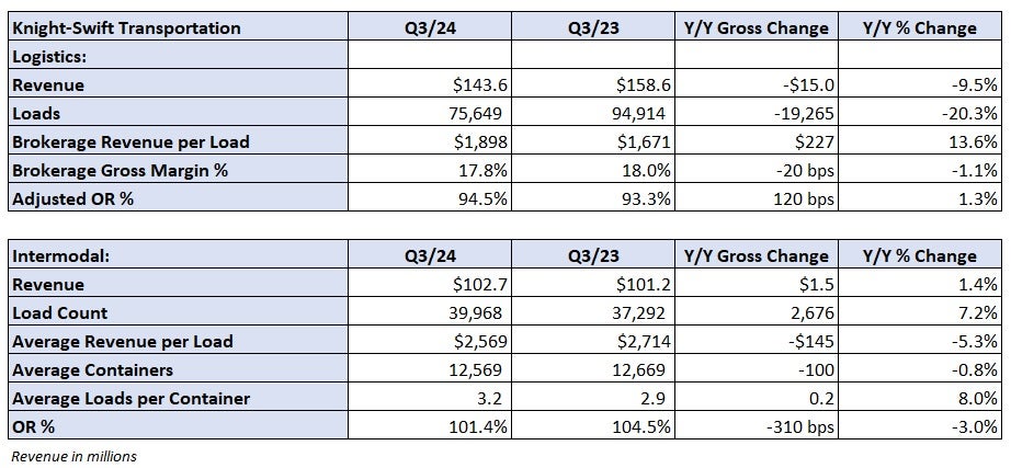 The logistics segment, which includes truck brokerage, saw revenue fall 9.5% y/y as a 21.1% decline in loads was partially offset by a 13.6% increase in revenue per load. The unit reported a 94.5% adjusted OR, 120 bps worse y/y.