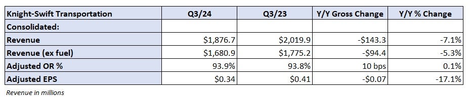 Knight-Swift (NYSE: KNX) reported third-quarter adjusted earnings per share of 34 cents Wednesday after the market closed. The result was at the top end of management’s guidance range (31 to 35 cents), beating the consensus estimate by 2 cents, but lagging the year-ago result by 7 cents.