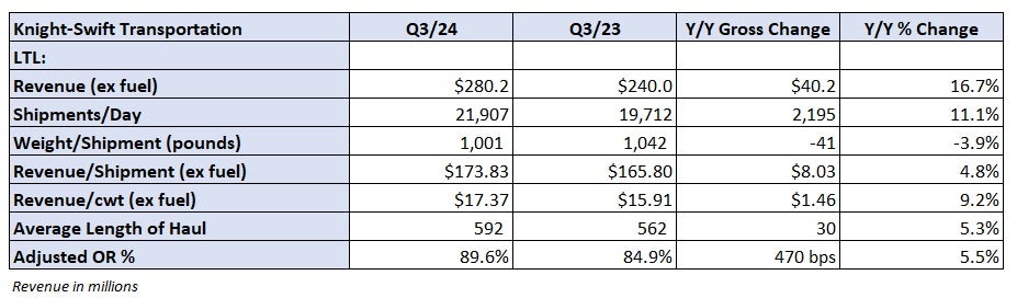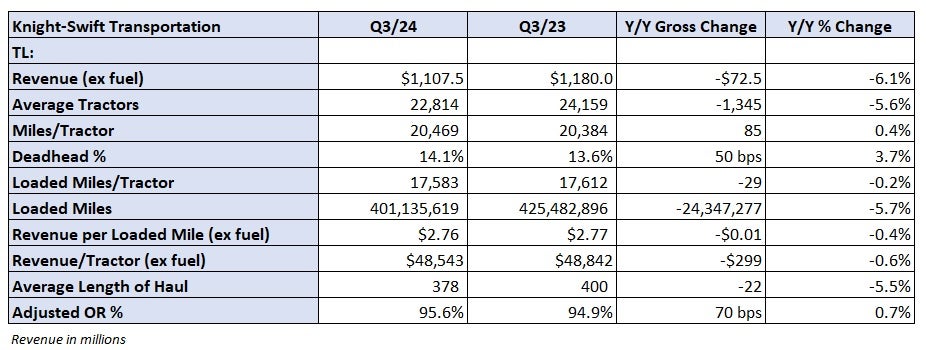 The TL unit reported a 95.6% adjusted operating ratio (inverse of operating margin), 70 basis points worse y/y but 160 bps better than the second quarter. Knight-Swift’s legacy operations saw a 250-bp sequential OR improvement while U.S. Xpress’ operations were a 220-bp drag during the quarter.